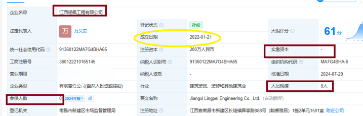 与江西翎佩受同一实控人控制的江西曌瀚智能建设工程有限公司(下称“江西曌瀚”),也是云眼视界报告期内的前五大供应商。但天眼查显示,该供应商的参保员工人数为0,实缴资本也为0。
