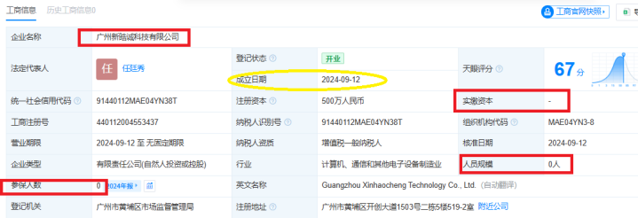 然而成立不久就成为云眼视界第一大供应商的新晧诚,天眼查显示新晧诚参保员工人数为0(2024年年报数据,下同),实缴资本为0。