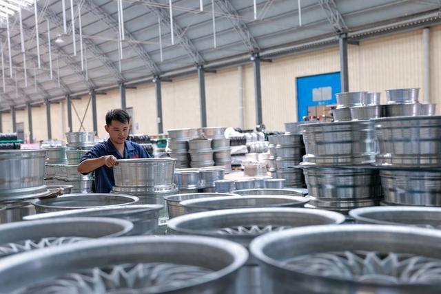 7月10日,工人在山东省聊城市茌平区一家铝制品有限公司车间内搬运汽车零部件。(新华社)
